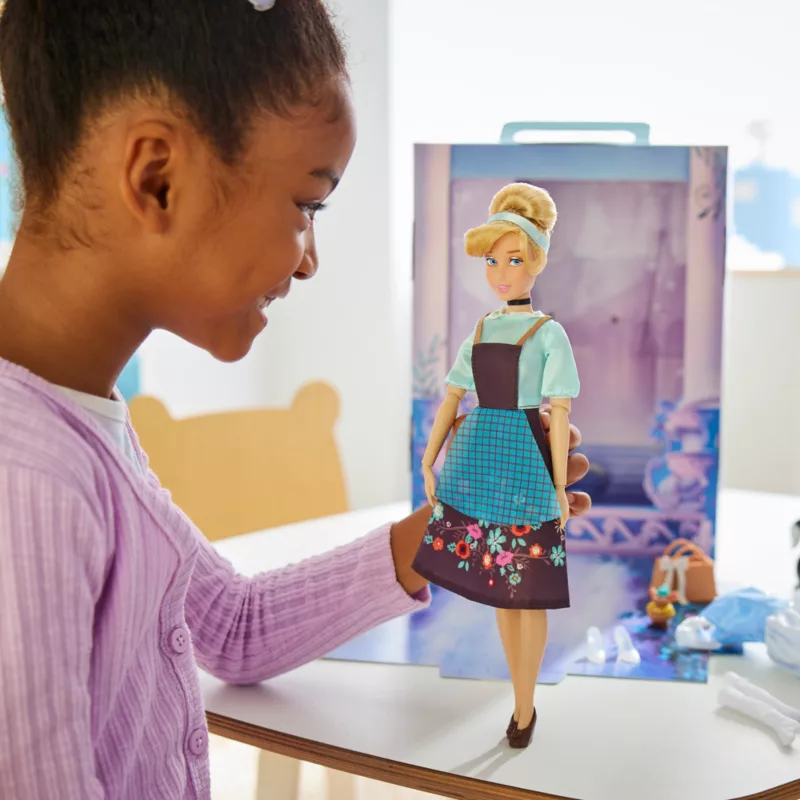 ‘They can’t stop me from dreaming,’ said Cinderella. For the Disney Story Doll assortment, our beloved Princess Dolls are enhanced by an additional outfit and accessories to more fully play out the character’s story. Recreate the film or imagine a brand new adventure! The sustainable, reusable packaging folds out into a play area stage, and features a colouring and activity sheet in back. Cinderella is a vision of fairytale grace in her glittering ballgown with floral print skirt. Included are her rag dress, shoes, basket – plus Gus and Lucifer figures.
