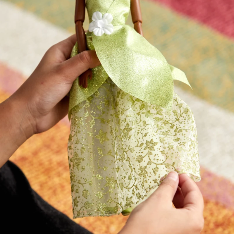 Our Tiana Classic Doll enchants all in her masquerade gown of glittering green petals. Fully posable, she inspires dreamers to determine their own destiny. Tiana comes with a beautiful doll brush!