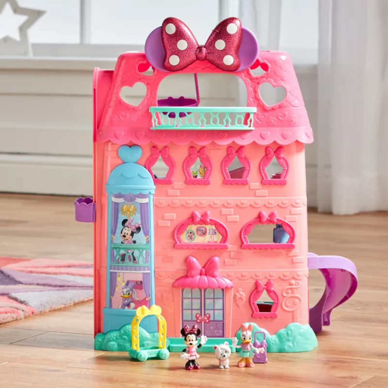 - Playset includes: Bow-Tel Hotel, slide, Minnie Mouse bow, 1 electronic reception desk, 1 articulated Minnie Mouse figure, 1 articulated Daisy Duck figure, 1 Snowpuff figure, 2 beds, 1 lamp, 1 sofa, 1 bathtub, 1 toilet, 1 hammock, 1 computer desk, 1 table, 2 chairs, 1 luggage cart, and 1 piece of luggage