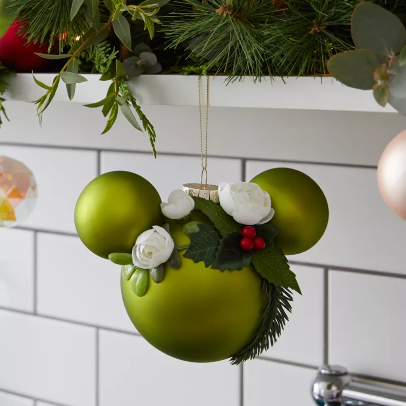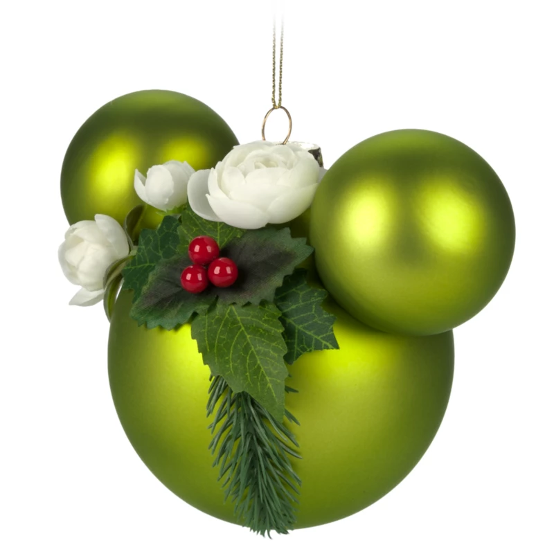 Add a floral touch to your seasonal decor with our fa-mouse Mickey icon! A pearled green finish, fabric flowers and holly with ivy sow the seeds of a happy holiday on this gleaming glass ornament that brings the bounty of nature to your family tree.