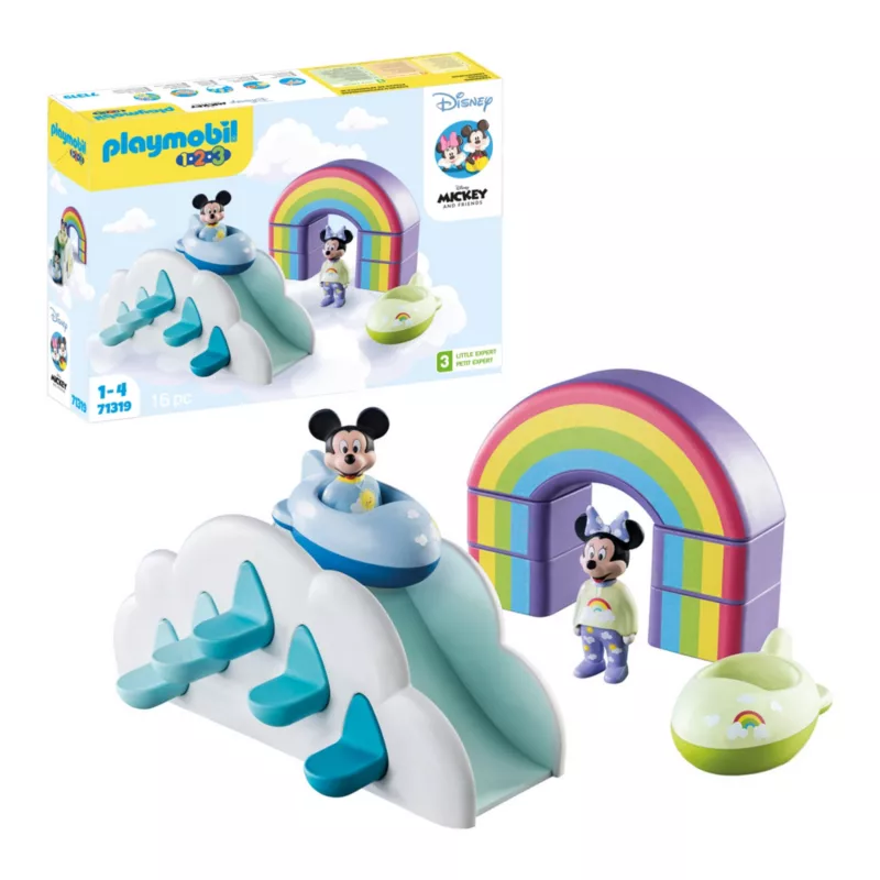 - Includes: 1 Mickey Mouse figure in pyjamas, 1 Minnie Mouse figure in pyjamas, 1 cloud house with sun door, 1 rainbow with rattle function, 4 rainbow building blocks to stack and puzzle, 5 raindrop puzzle pieces and 2 dream planes