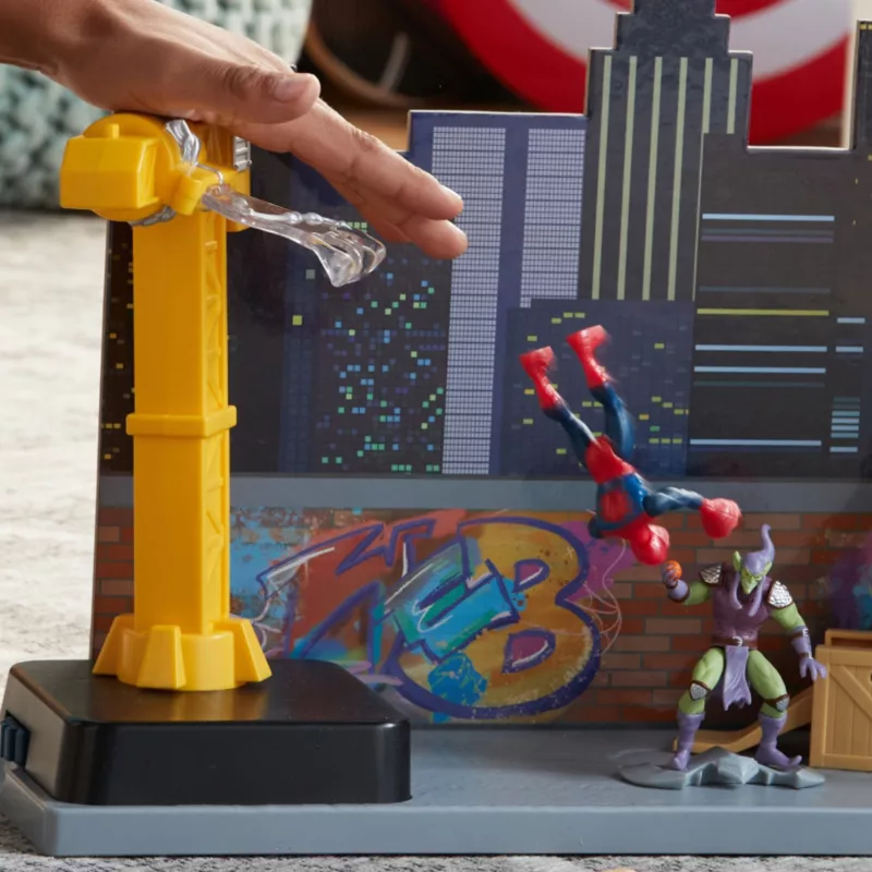 - Includes: 1 Spider-Man figure, 1 Green Goblin figure, 1 crate, 1 see-saw, 1 car, 1 glider and 2 webs